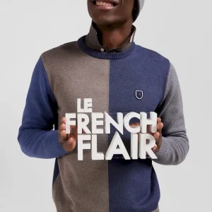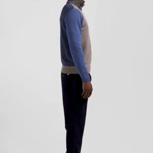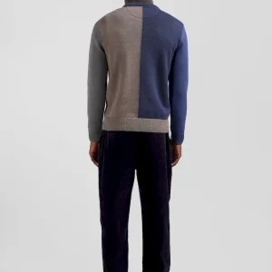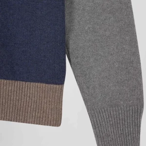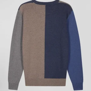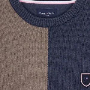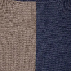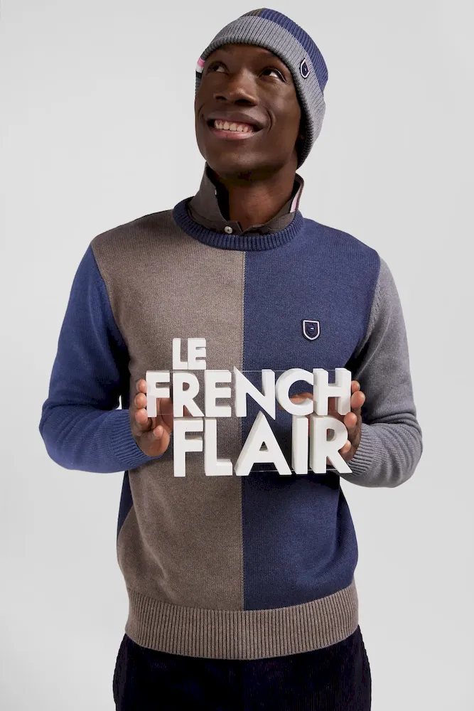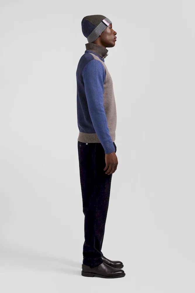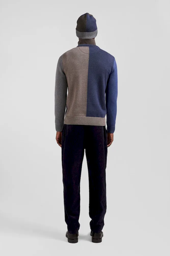 Pull col rond colorblock en coton bleu chiné et marron coupe Regular