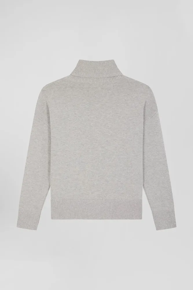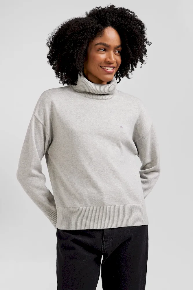 Ce pull col roulé uni, conçu dans un mélange confortable de fibres naturelles associant 55% de laine et 45% de coton, allie chaleur et douceur. Doté de bords-côtes pour une finition soignée et une tenue parfaite, ce pull féminin à la coupe légèrement ample est orné d’une discrète broderie nœud papillon, signature d’Eden Park. Disponible en six coloris intemporels, ce pull à col roulé doux est idéal pour enrichir votre garde-robe hivernale avec élégance et simplicité.