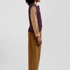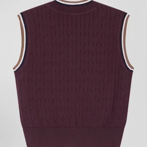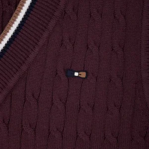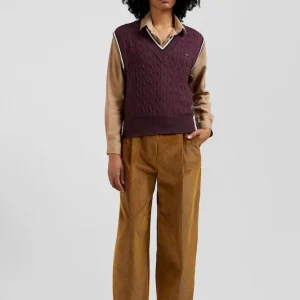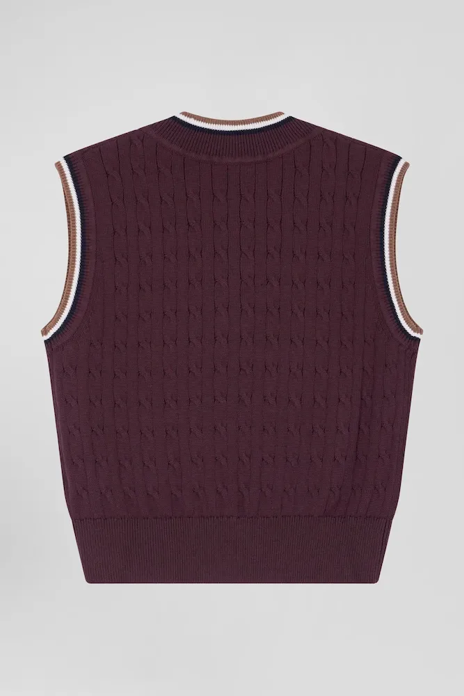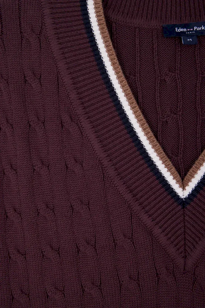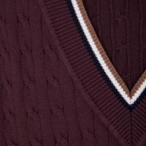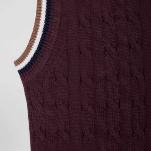 Optez pour un look sport chic avec notre pull sans manches à torsades pour femme, parfait en superposition ou porté seul. Ce modèle présente un élégant liseré contrasté au col V et aux bordures de manches, ajoutant une touche de raffinement. Les torsades classiques offrent un jeu de texture, faisant de ce pull sans manches un essentiel, idéal sur une chemise pour une allure sophistiquée ou à même la peau pour une tenue tendance.