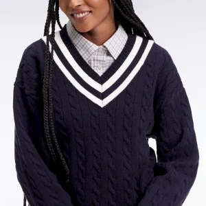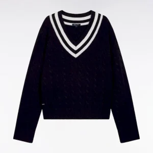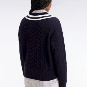 Inspiré des terrains de sport les plus élégants, ce pull cricket revisite l’iconique col en V à rayures contrastées dans une coupe oversized des plus contemporaines. Tricoté dans une maille torsadée marine à la douceur enveloppante grâce à l’alliance laine et coton, ce pull femme mêle esprit preppy et style urbain. À porter avec une chemise accessoirisée d’une cravate et un pantalon large pour cultiver l’élégance décontractée propre à notre maison
