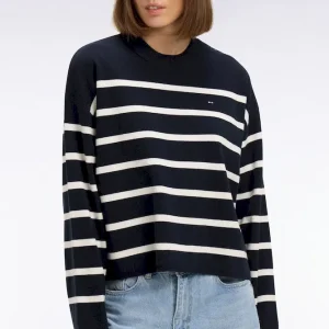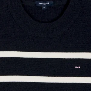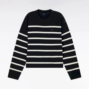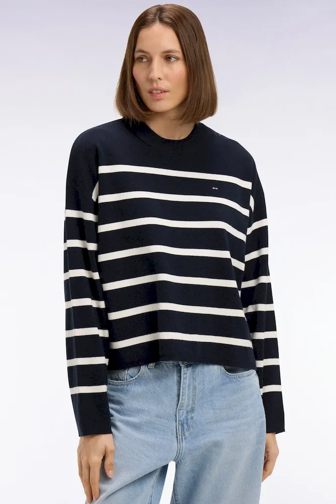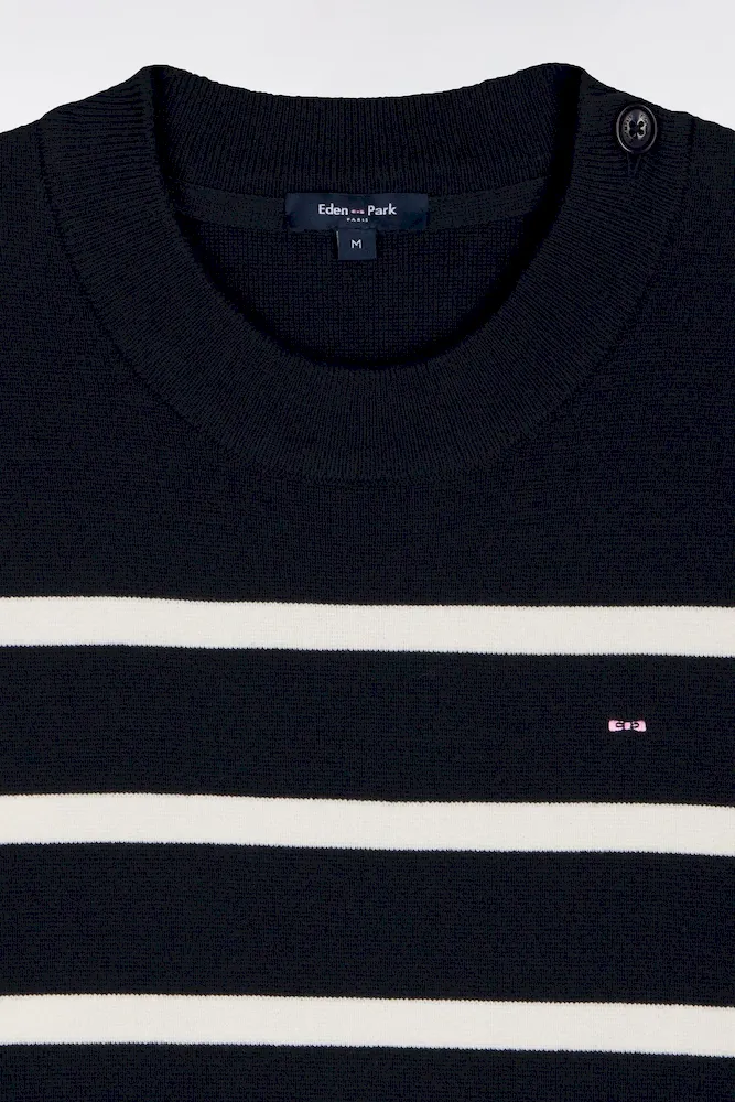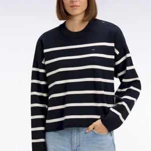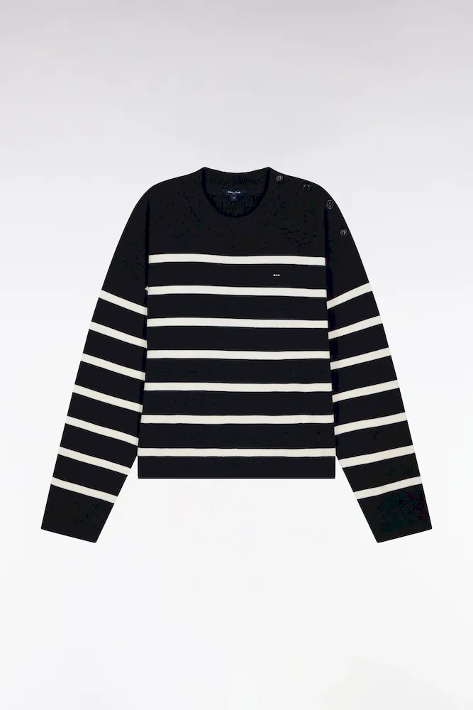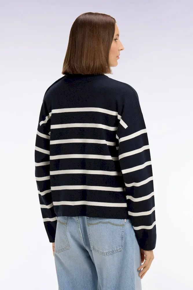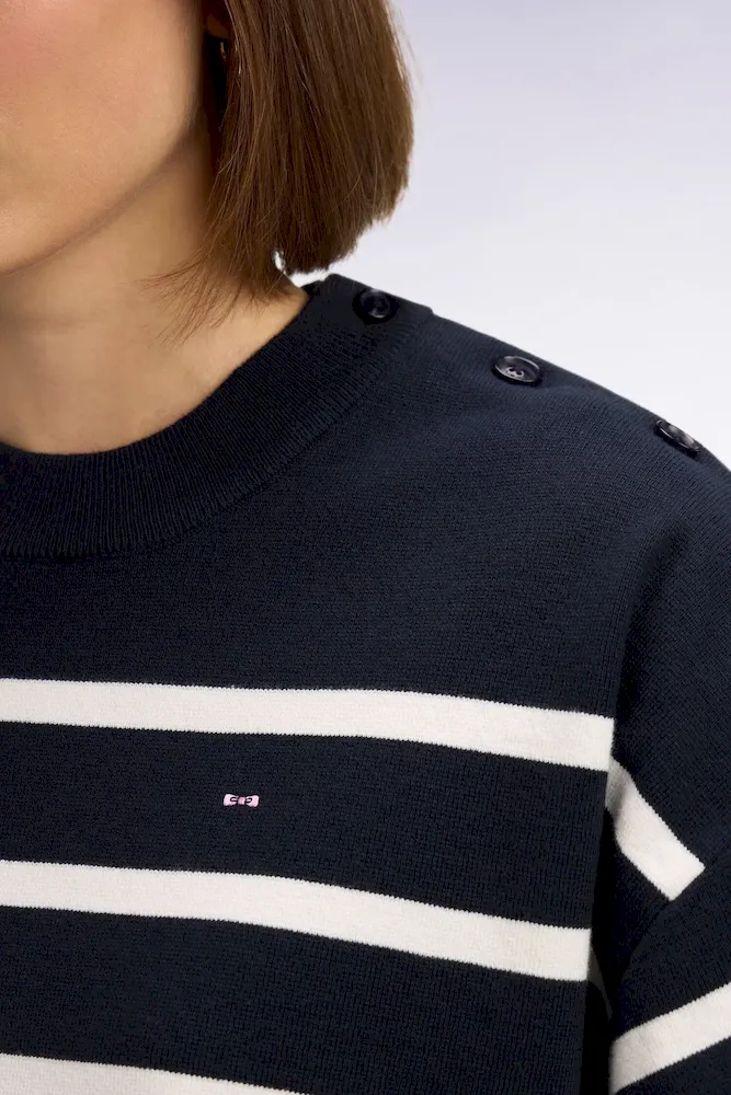Ce pull marinière confectionné en maille milano pour un tomber plus dense et élégant offre une allure graphique contemporaine. Son ouverture d’épaule fermée par des boutons personnalisés Eden Park apporte une touche féminine et moderne, tandis que le nœud papillon brodé signe ce pull femme avec discrétion. Parfaite avec un short en denim ou un petit short en milano marine coordonné, cette marinière compose des looks d’été chic et structurés. Un intemporel facile à coordonner à vos favoris qui enrichira durablement votre vestiaire printemps été grâce à la qualité de sa confection et à son allure soignée.