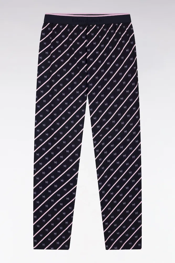 Signature graphique de la maison, le nœud papillon s’invite sur le pantalon de ce pyjama long dans un motif répété emblématique de notre vestiaire sport-chic. Associé à un T-shirt uni marine à col V, cet ensemble pyjama confortable et tendance incarne parfaitement l’élégance du vestiaire de nuit Eden Park