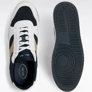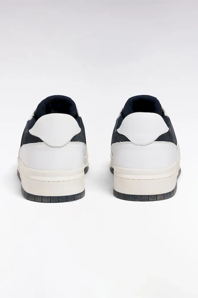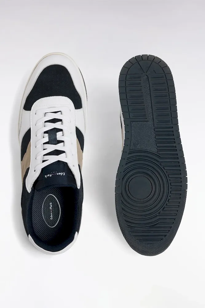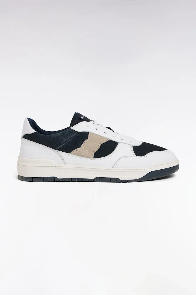 Cette sneaker en cuir lisse blanc animé de cuir suédé marine et beige séduit par sa ligne sportive et son allure moderne. Ses découpes suédé nœud papillon apporte une élégance discrète, tandis que la semelle contrastée assure confort et stabilité tout en rappelant les lacets. blancs. Facile à associer, ces sneakers homme accompagnent aussi bien un jean qu’un jogging ou un chino.