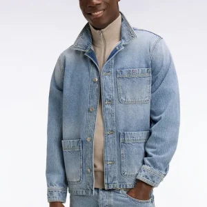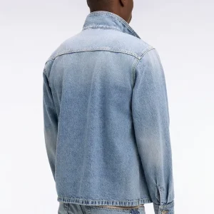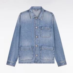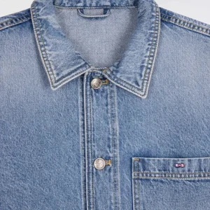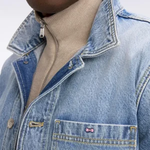 Inspirée du vestiaire workwear, la surchemise en denim fait partie des piliers du vestiaire masculin que l’on prend plaisir à retrouver. Ce modèle façonné en denim bleu délavé non doublé arbore trois poches plaquées accentuant sa silhouette utilitaire. Poignets et pattes de boutonnage sont accessoirisés de boutons en métal siglés tandis que notre emblématique broderie nœud papillon rose s’appose discrètement sur sa poche poitrine. Un essentiel masculin à porter en veste de mi saison ou sous un blouson. Pour compléter votre tenue, plusieurs jeans aux coupes flatteuses sont proposés dans la même toile denim au délavage coordonné à cette surchemise en jean.