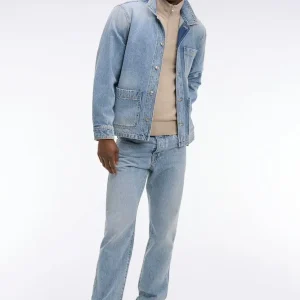 Inspirée du vestiaire workwear, la surchemise en denim fait partie des piliers du vestiaire masculin que l’on prend plaisir à retrouver. Ce modèle façonné en denim bleu délavé non doublé arbore trois poches plaquées accentuant sa silhouette utilitaire. Poignets et pattes de boutonnage sont accessoirisés de boutons en métal siglés tandis que notre emblématique broderie nœud papillon rose s’appose discrètement sur sa poche poitrine. Un essentiel masculin à porter en veste de mi saison ou sous un blouson. Pour compléter votre tenue, plusieurs jeans aux coupes flatteuses sont proposés dans la même toile denim au délavage coordonné à cette surchemise en jean.