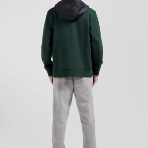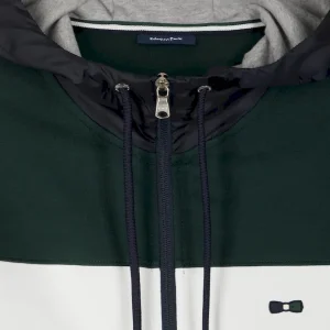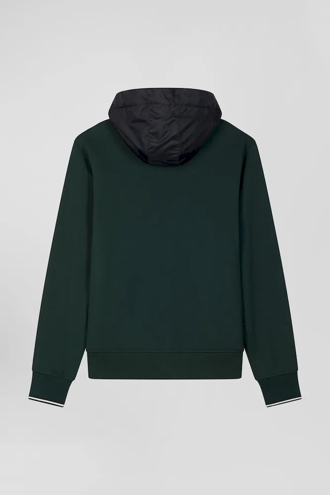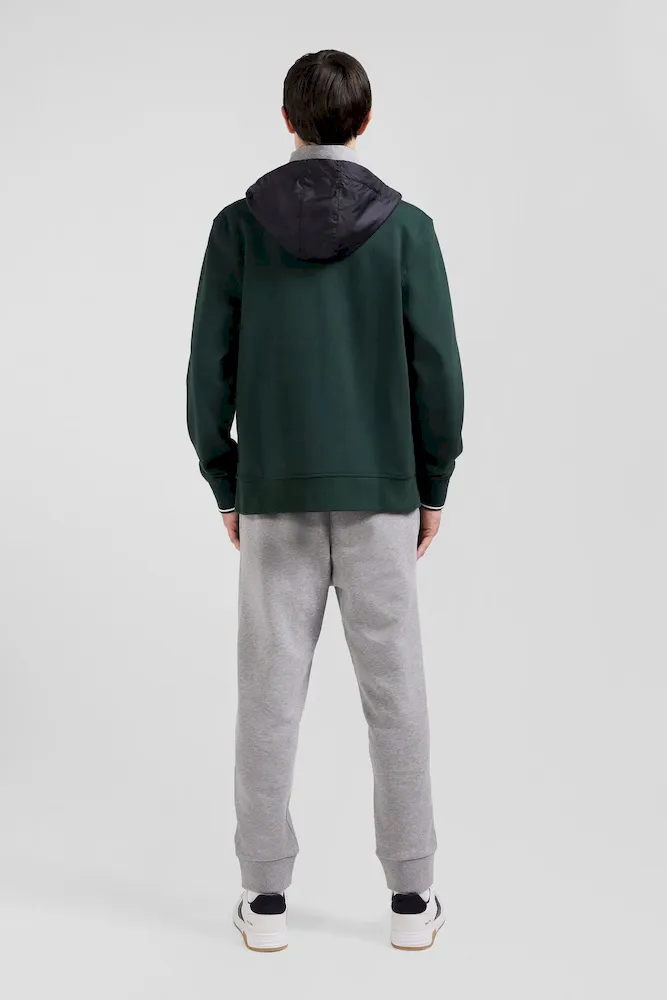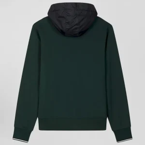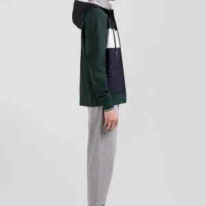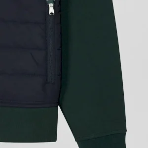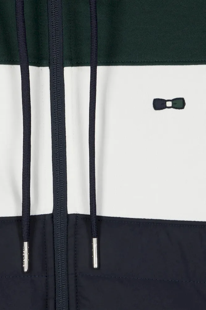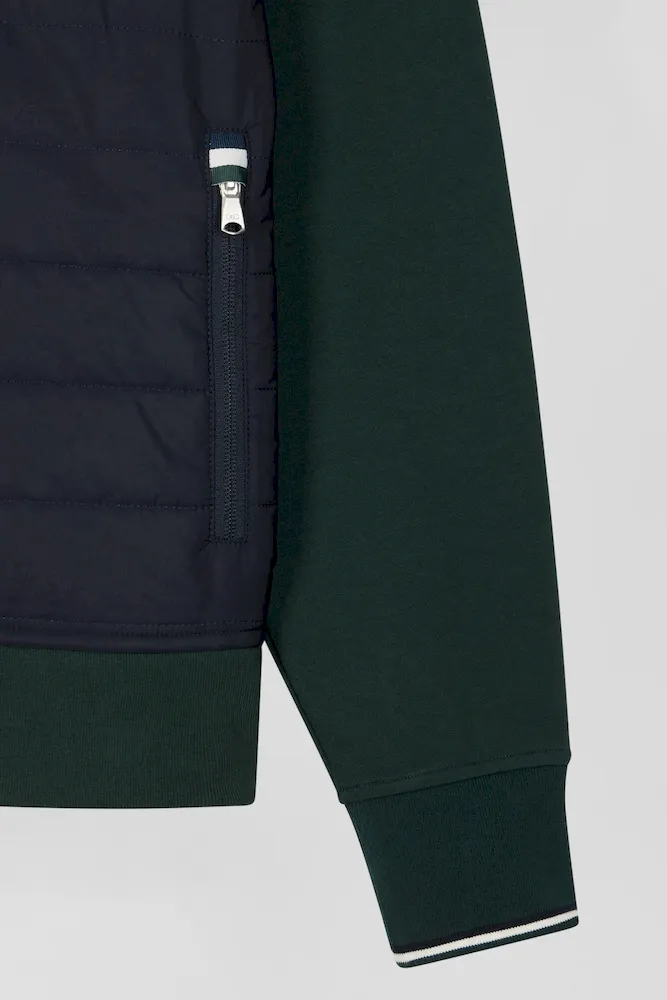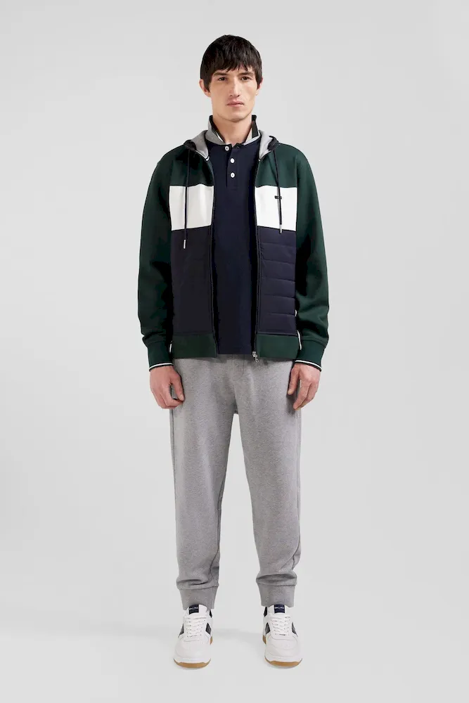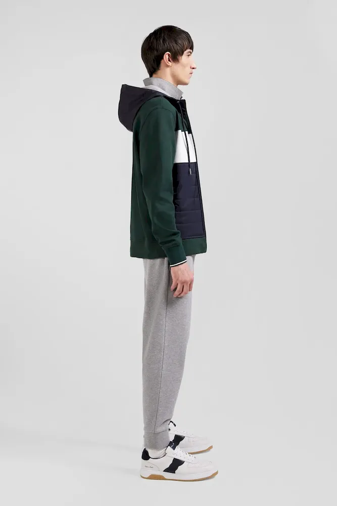 Notre sweatshirt zippé en interlock offre un confort et une douceur exceptionnels grâce à sa maille double. Son design est rehaussé par un jeu de colorblock dynamique et une capuche intégrée en nylon. L’empiècement matelassé en nylon à l’avant évoque l’aspect d’une doudoune, ajoutant une touche originale. Les poignets en bords-côtes rayés lui apportent une finition sportive, tandis que les détails argentés ajoutent une note d’élégance à ce sweatshirt se substituant facilement à une veste de mi-saison.