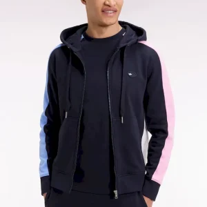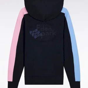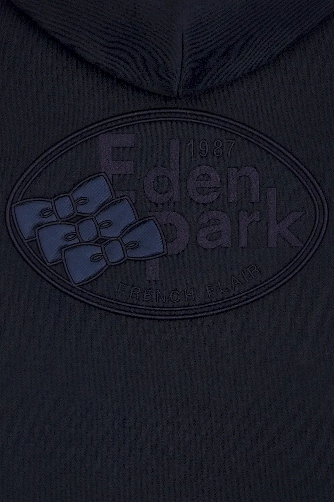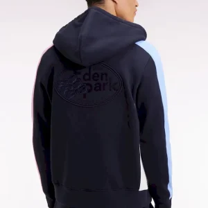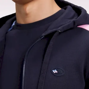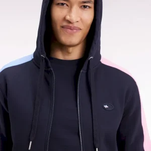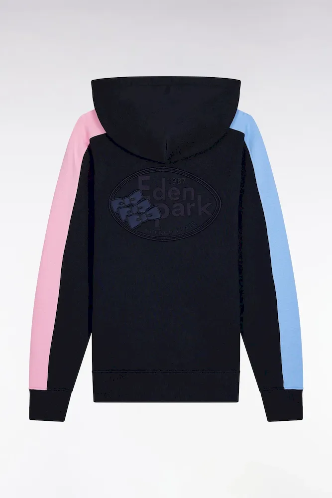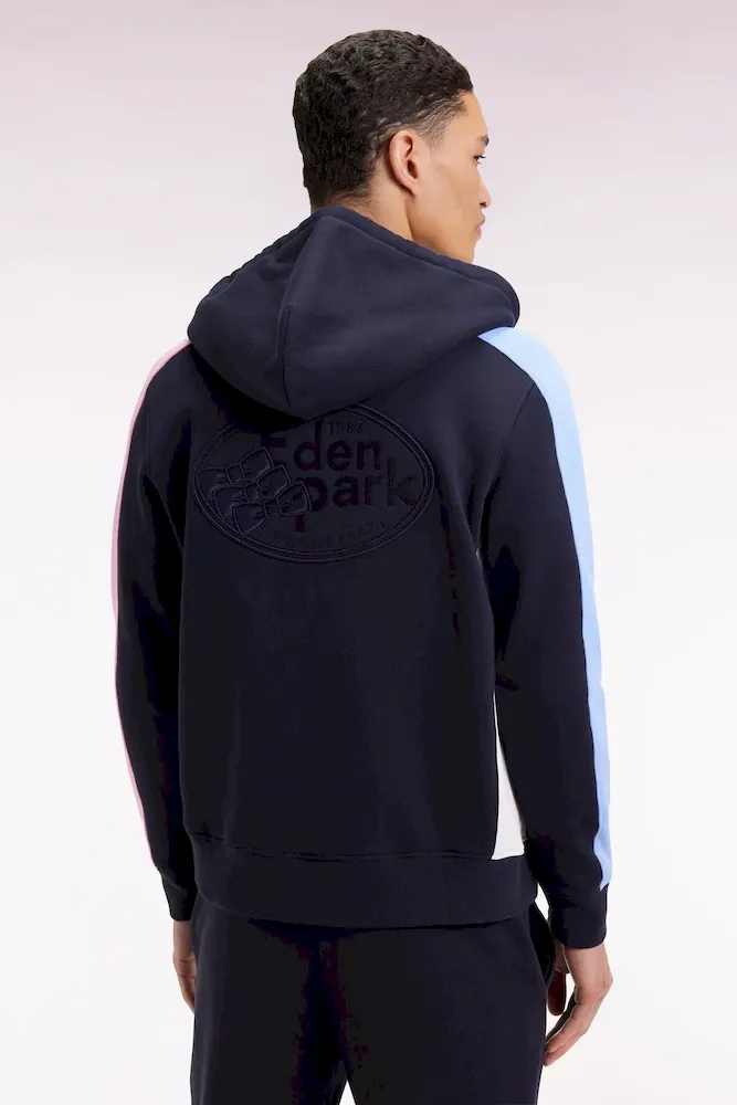 Ce sweatshirt zippé à capuche intégrée est confectionné en molleton gratté 100 % coton. Il conjugue esprit graphique et confort absolu. Son jeu de couleurs en camaïeux de bleu et rose sur les manches dynamise la silhouette, tandis qu’une broderie dans le dos, enrichie d’aplats en tissu cravate, souligne le savoir-faire des ateliers Eden Park