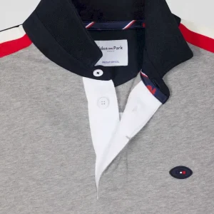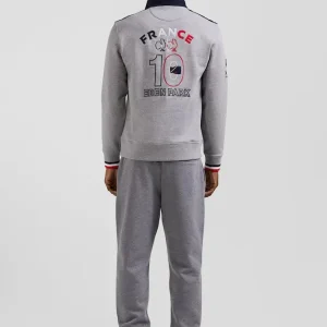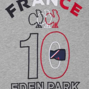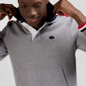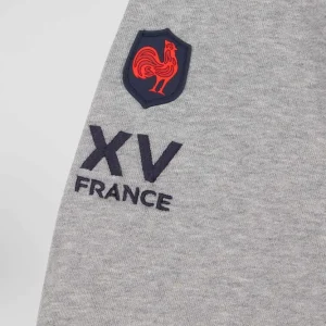 Ce sweatshirt en coton gris chiné est conçu en collaboration avec le XV de France. Ce modèle présente un col de maillot de rugby et est orné d’une broderie du coq français iconique sur le dos. Les épaules sont rehaussées par des rayures bleu, blanc et rouge, ajoutant une touche sportive moderne. Parfait pour les amateurs de rugby et les adeptes de la mode, ce sweatshirt avec poche kangourou assure un look décontracté et tendance.