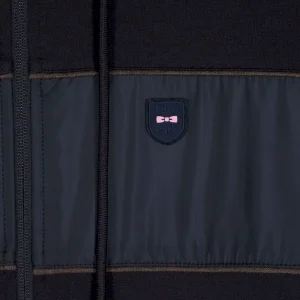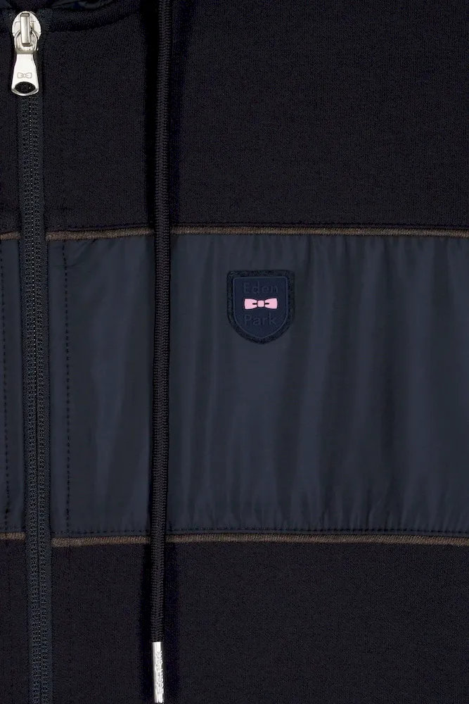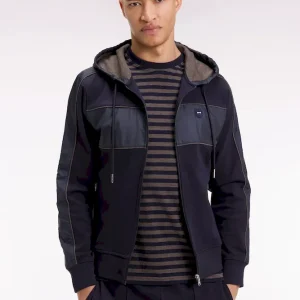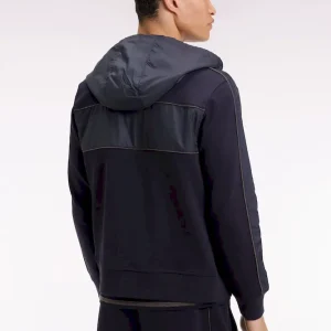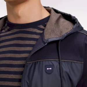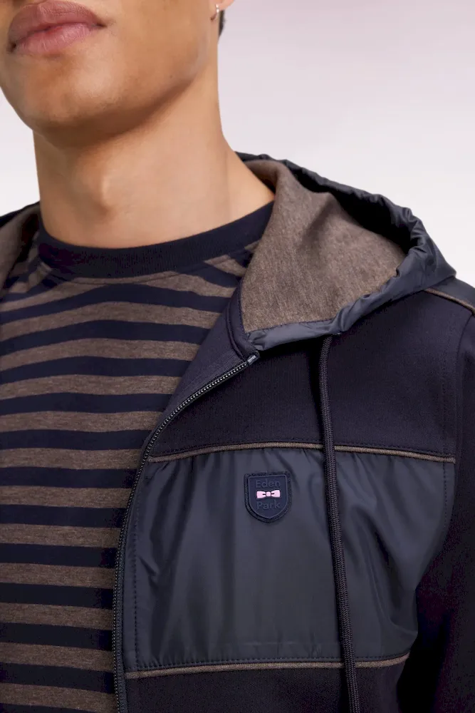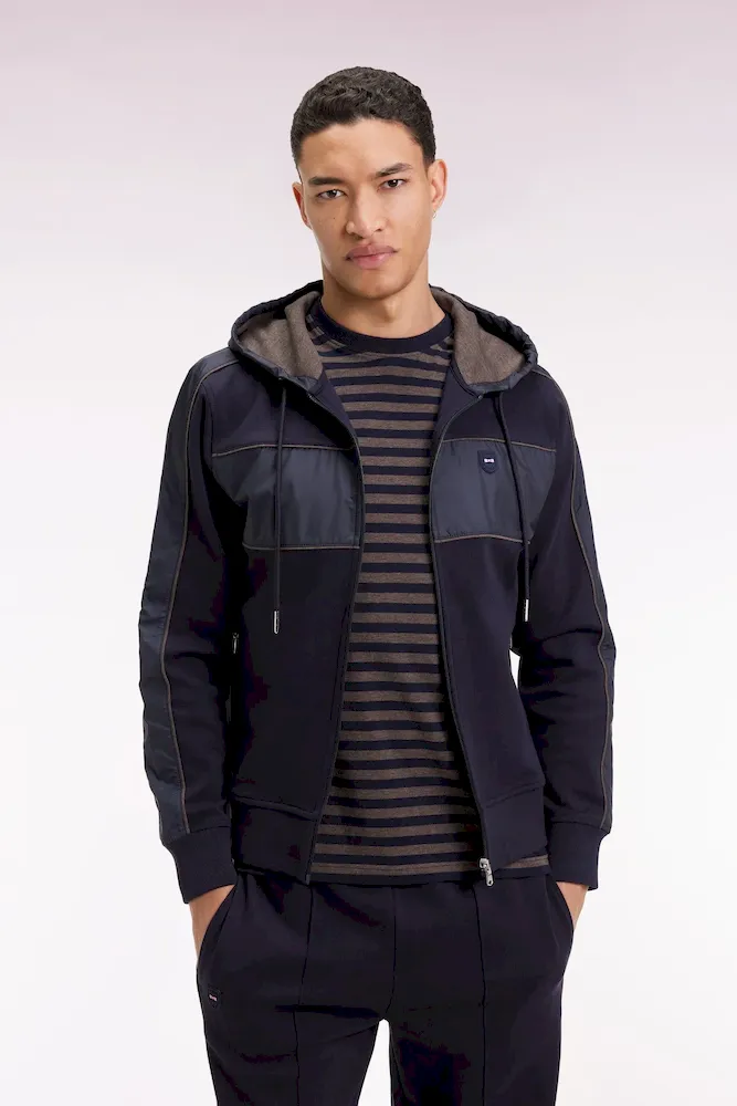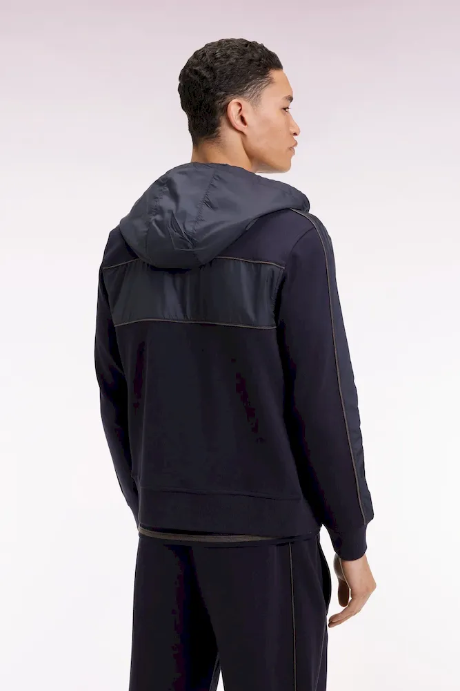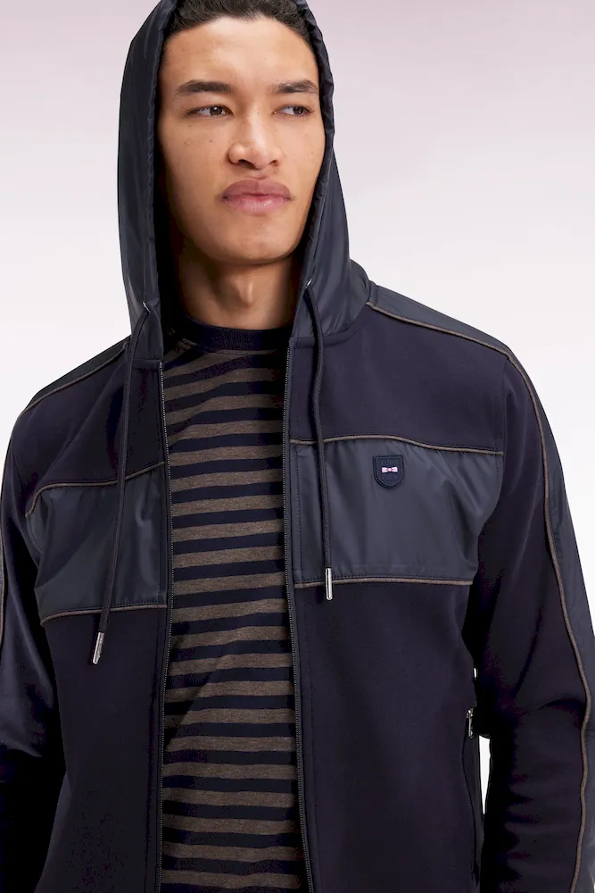 Sweatshirt zippé à capuche en molleton et nylon marine et beige