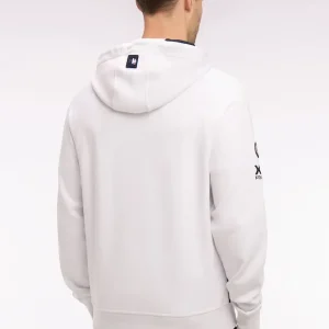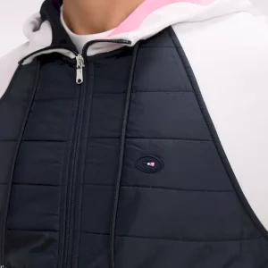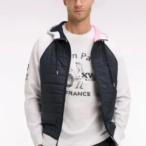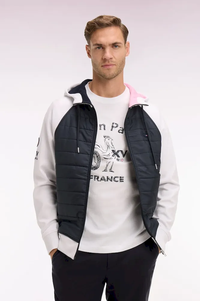 Ce sweatshirt zippé bicolore réalisé dans une coupe raglan plus moderne associe une parmenture frontale matelassé marine à des manches, un dos et une capuche en molleton blanc ou marine, selon le coloris choisi, pour une allure contemporaine sans compromis sur le confort. Le jeu de couleurs contrastées, la capuche doublée et les détails signature du XV de France créent une silhouette athlétique et moderne. Un modèle pensé pour les journées fraîches, entre confort et style urbain que vous le portiez en sweatshirt ou en veste de mi-saison.