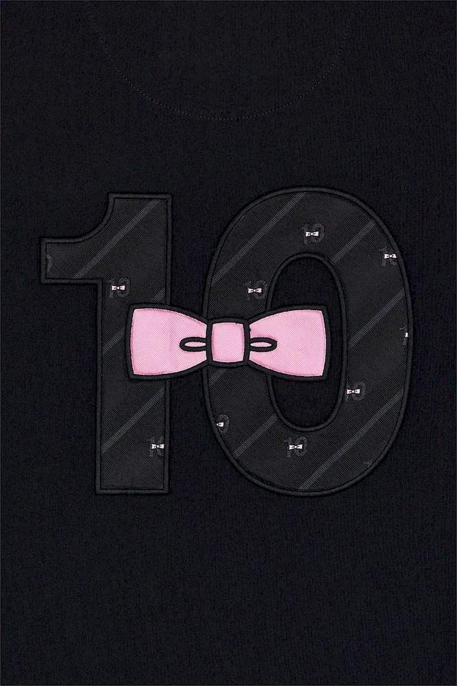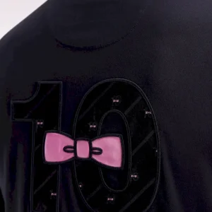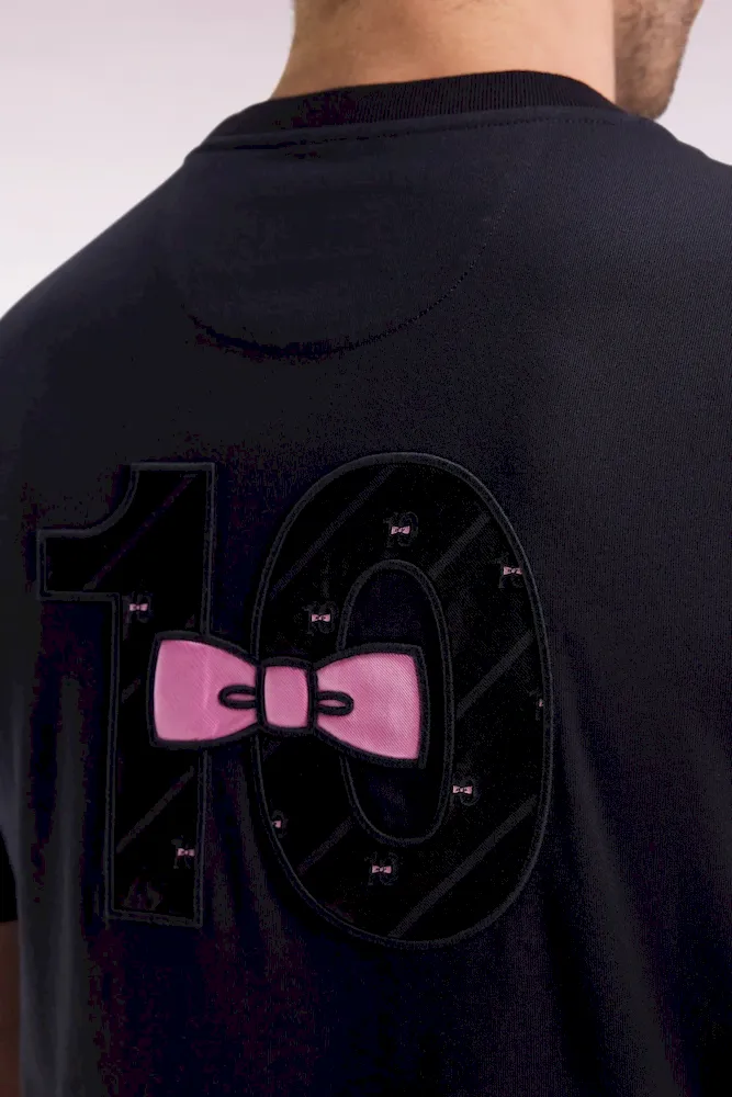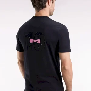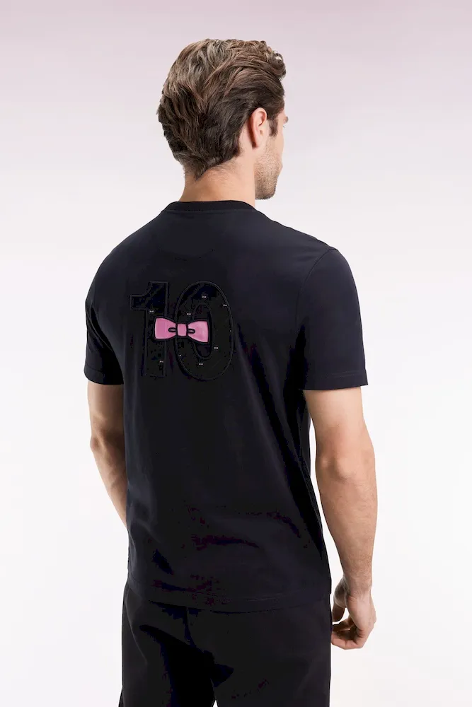 Ce T-shirt en jersey de coton joue la carte du détail. Dans le dos, une broderie spectaculaire mêle incrustations de tissu cravate à l’imprimé nœud papillon et tissu cravate uni rose. Ce modèle emblématique du style de notre vestiaire comporte toutes nos finitions signature