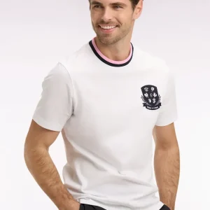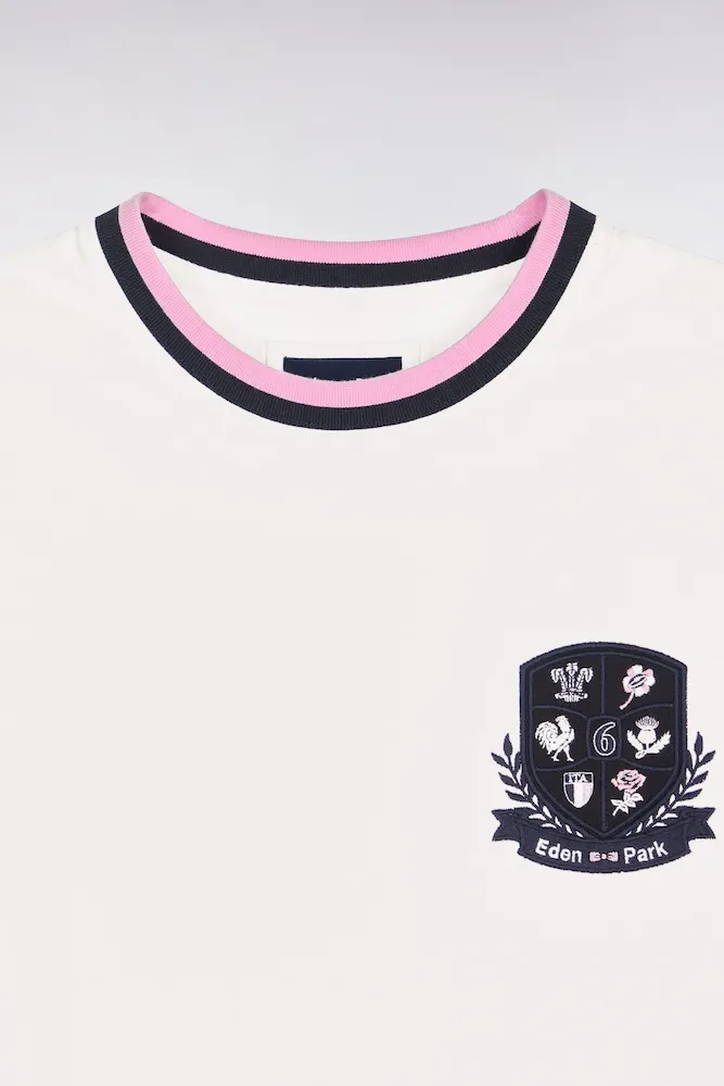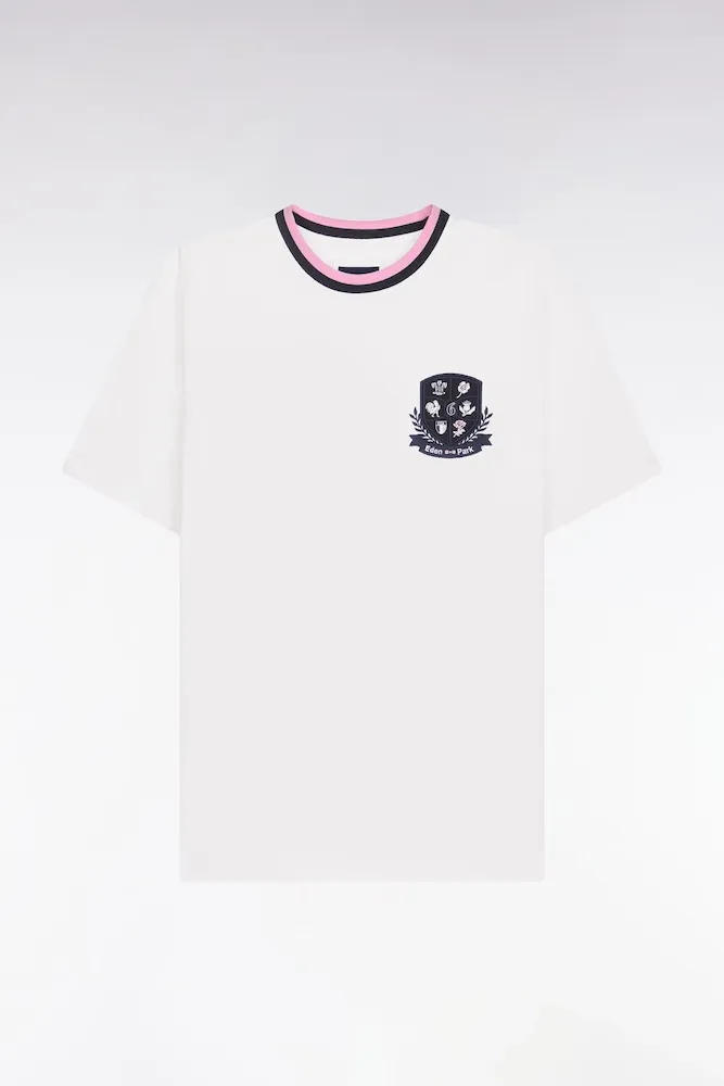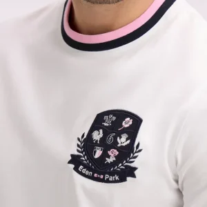 Ce T-shirt homme associe une coupe droite confortable à un écusson hommage au Tournoi des 6 Nations qui signe son identité. Le port de tête est mis en valeur par un col rond aux finitions bords-côtes rayées pour une tenue durable. Une pièce facile à porter, conçue pour compléter une silhouette décontractée sans jamais en faire trop. Confectionné dans un jersey coton blanc de grande qualité.