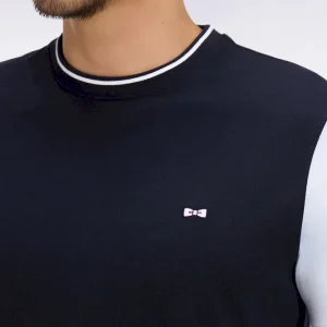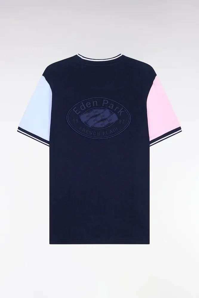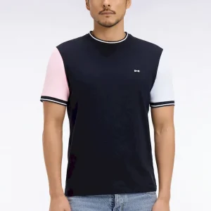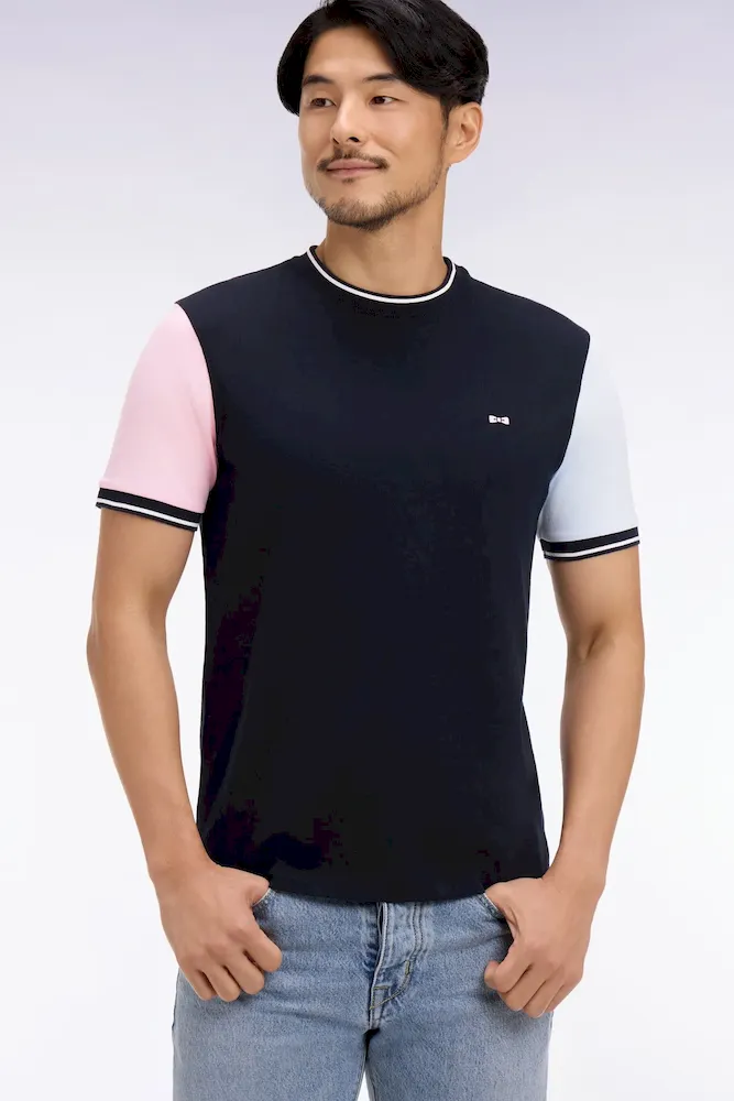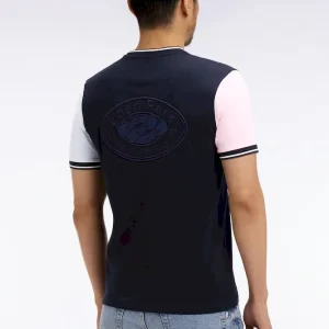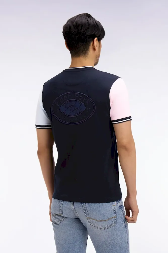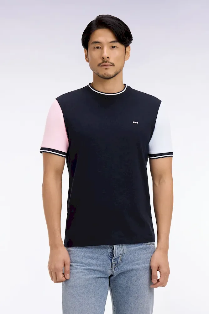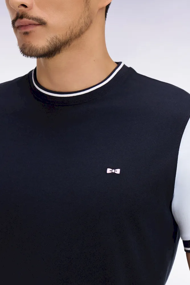 Ce T-shirt à manches courtes bicolores se distingue par un jeu de contrastes équilibré et une coupe droite à la construction nette. Sa matière en jersey de coton assure un porté agréable et léger, tandis que sa broderie dos et ses bords-côtes tricotés à finition rayée apportent une touche sportive à votre vestiaire du quotidien.