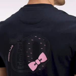 Ce T-shirt à manches courtes se distingue par une sérigraphie exclusive dans le dos, sublimée par une application de tissu cravate imprimé. Ce détail signature apporte relief et caractère à cette pièce volontairement épurée sur l’avant. Un modèle pensé pour affirmer l’ADN Eden Park avec élégance et modernité, de sa subtile broderie emblème à son col rond aux finitions bords-côtes.